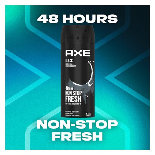 Stay fresh. Smell irresistible. Axe Black deodorant body spray is a subtle woody-aromatic fragrance, with the fresh scent of frozen pear combining with the warmth of cedarwood. With breakthrough fragrance technology, this deodorant body spray keeps you fresh and smelling irresistible all day. Simply shake, twist and spray 15cm from underarm and all over body. Axe deodorant's patented enhanced formula actively fights bad odours. Some deodorants just mask body odour with a strong scent. Axe aerosol stops odour in its tracks, keeping you fresh and smelling great for up to 48 hours. Every man needs a signature cologne and smell that makes him feel at his very best. With Axe, you can find the perfect deodorant body spray to express your personality and your mood. Add Axe aerosol deodorant body spray to your personal hygiene arsenal to protect you from odour and help you to stay fresh and smell irresistible. Whatever the occasion, it lasts all day long. Axe deodorant body spray offers you protection from odour, keeping you smelling great just as a cologne for men would. A great day starts with a great shower followed by the fresh and masculine scent of Axe aerosol deodorant. You might not conquer the world afterwards, but you’ll feel like you can.